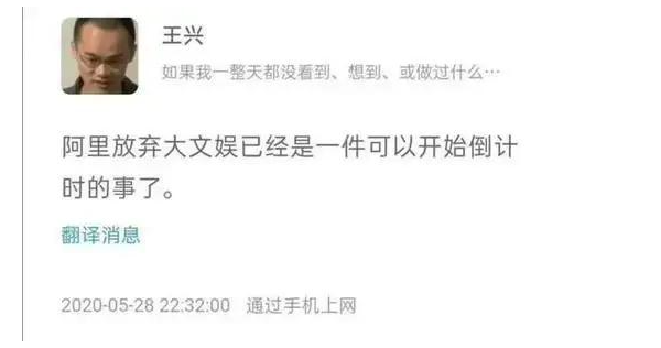2020年5月,美团王兴说阿里放弃大文娱已经进入倒计时。